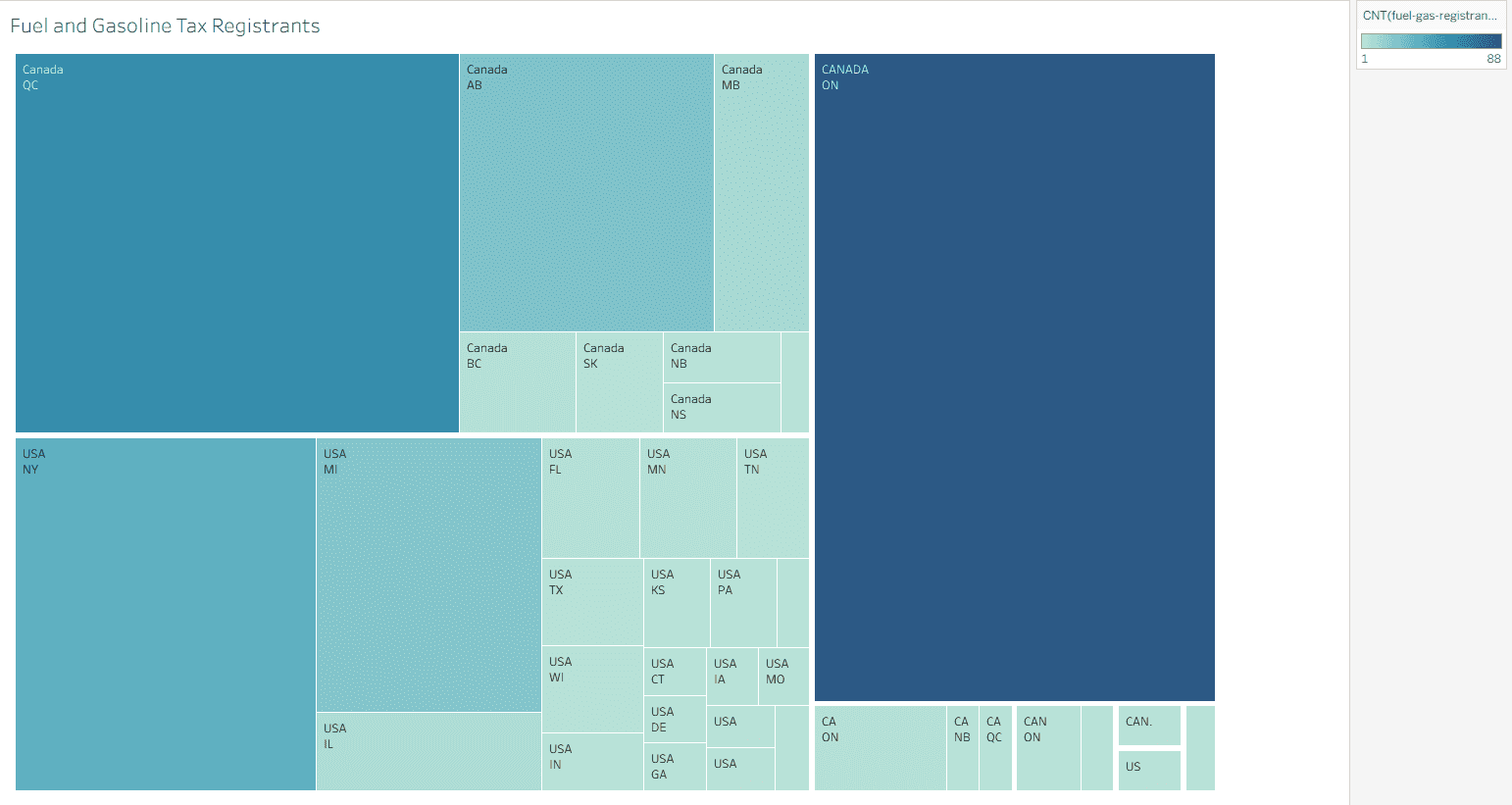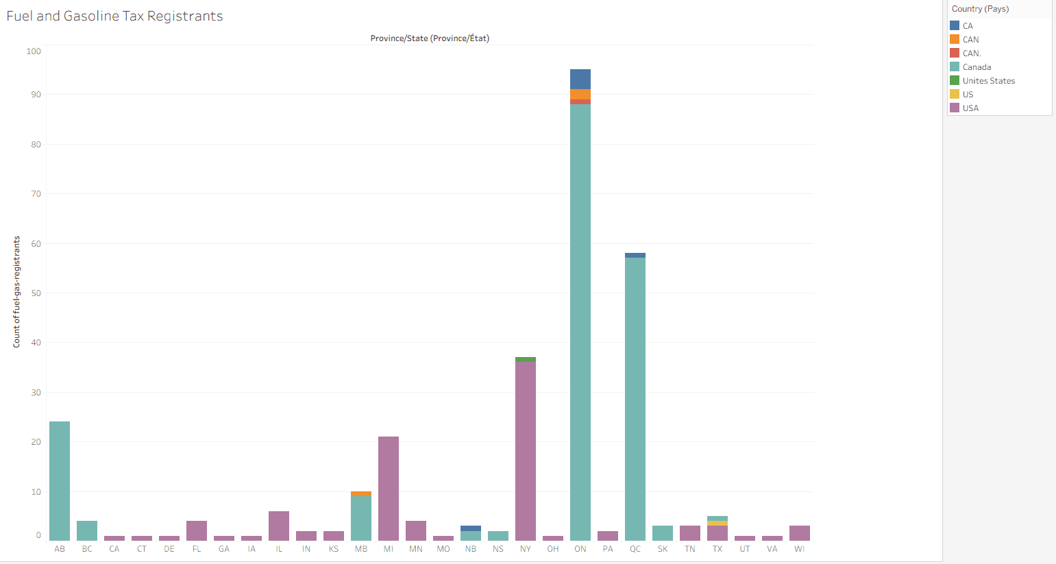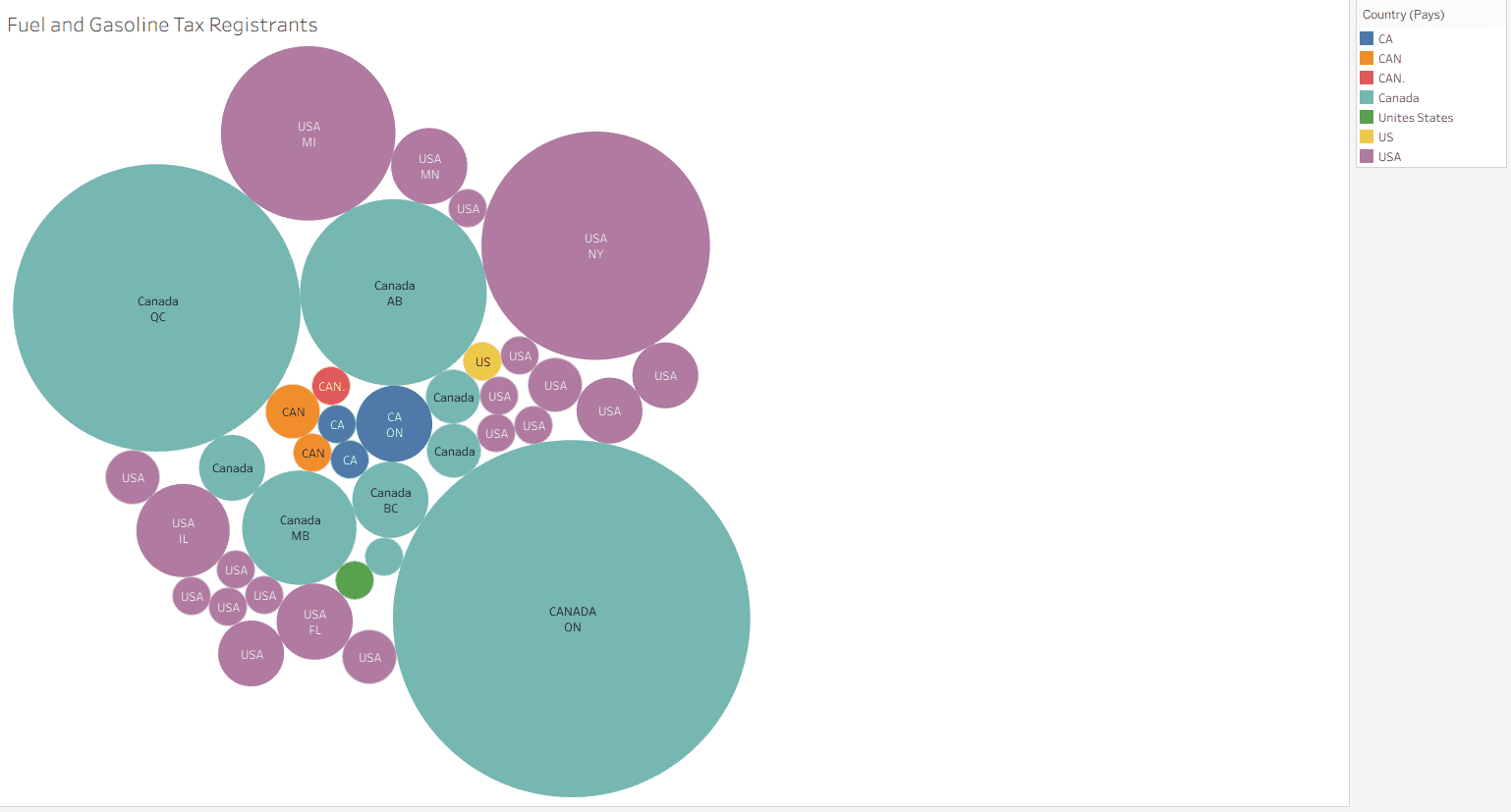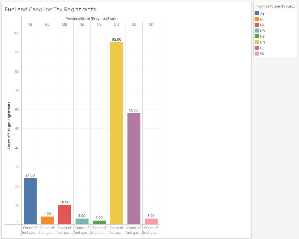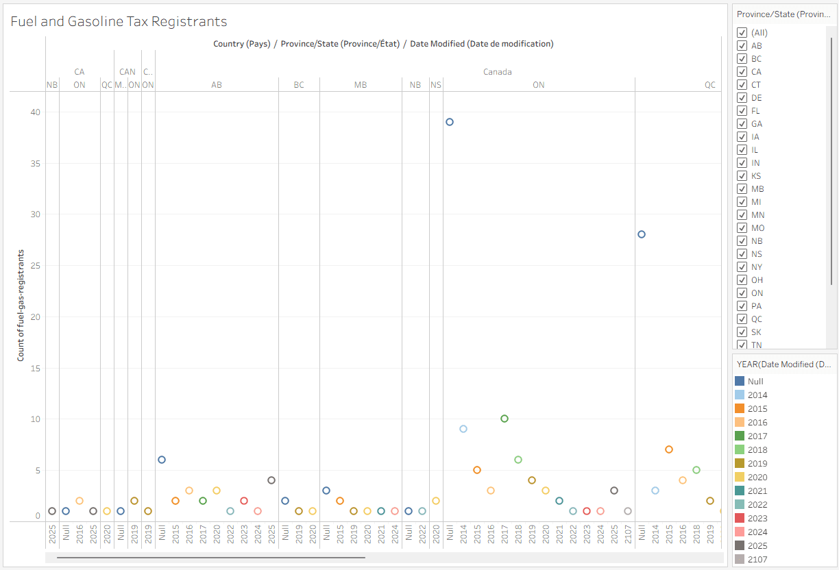 Research began by identifying the target audience and selecting a dataset from the official Ontario Government website detailing Fuel and Gasoline Tax Registrants across Canadian provinces. The visualization was designed for regulators, safety inspectors, and government workers aged 25–55 who monitor compliance and safety standards. To ensure clarity and efficiency, the design focused on readability, data hierarchy, and visual balance. The dataset was imported into Tableau to test multiple chart types, including Geolocation Maps, Stacked Bar Charts, Packed Bubbles, Treemaps, and Circle Charts. Each format was evaluated for its clarity, accuracy, and aesthetic effectiveness, with the final selection chosen for its ability to communicate regional patterns clearly to the target audience.