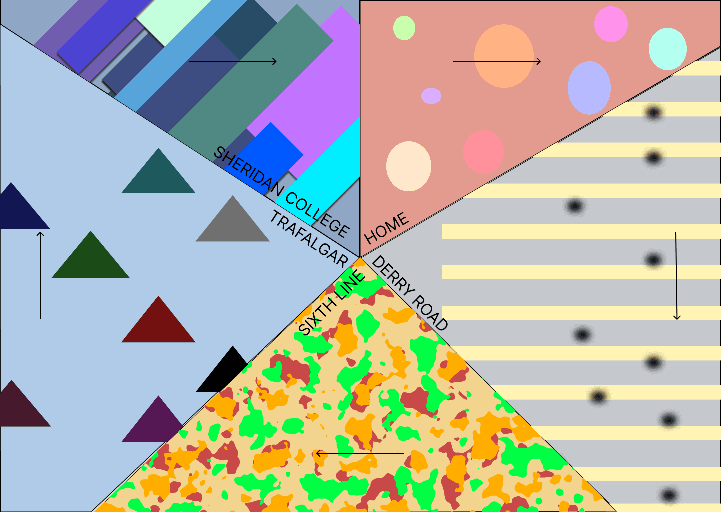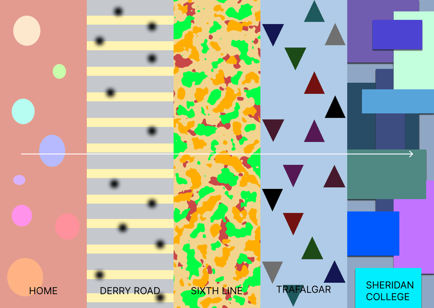 Visual development focused on testing how colour, typography, and shape language could best represent the mood and sensory changes of the commute. Applying each colour palette across the layouts showed how well the colours communicated emotional shifts from the calm tones of home, to the neutral road segments, to the warm focus of arriving on campus. Typography tests with Inter, Lora, and Poppins helped determine which typeface stayed readable across changing backgrounds, with Inter proving the most consistent and clear. Developing visual patterns for each location soft shapes for home, stripes for Derry, organic forms for Sixth Line, sharp angles for Trafalgar, and geometric blocks for Sheridan helped ensure that the emotions and sensory cues remained recognizable in both radial and linear layouts. These explorations strengthened clarity, consistency, and the overall storytelling of the final design.