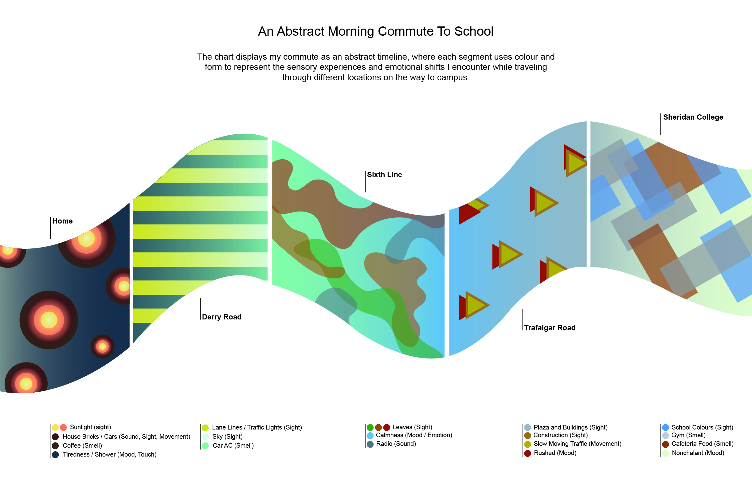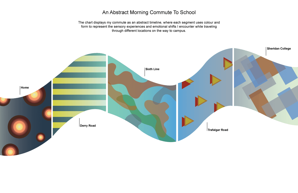 The final visualization translates the sensory and emotional rhythm of my morning commute into a clear, linear timeline supported by improved hierarchy, stronger typography, and a refined colour system. Each section uses shapes and palettes directly tied to the collected sensory data, allowing the viewer to understand how mood, atmosphere, and movement shift from home to campus. Peer feedback guided adjustments to clarity and structure, helping the design balance expressive abstraction with readable communication. The final outcome presents a cohesive visual narrative that captures the commute not as a route, but as an evolving emotional experience.