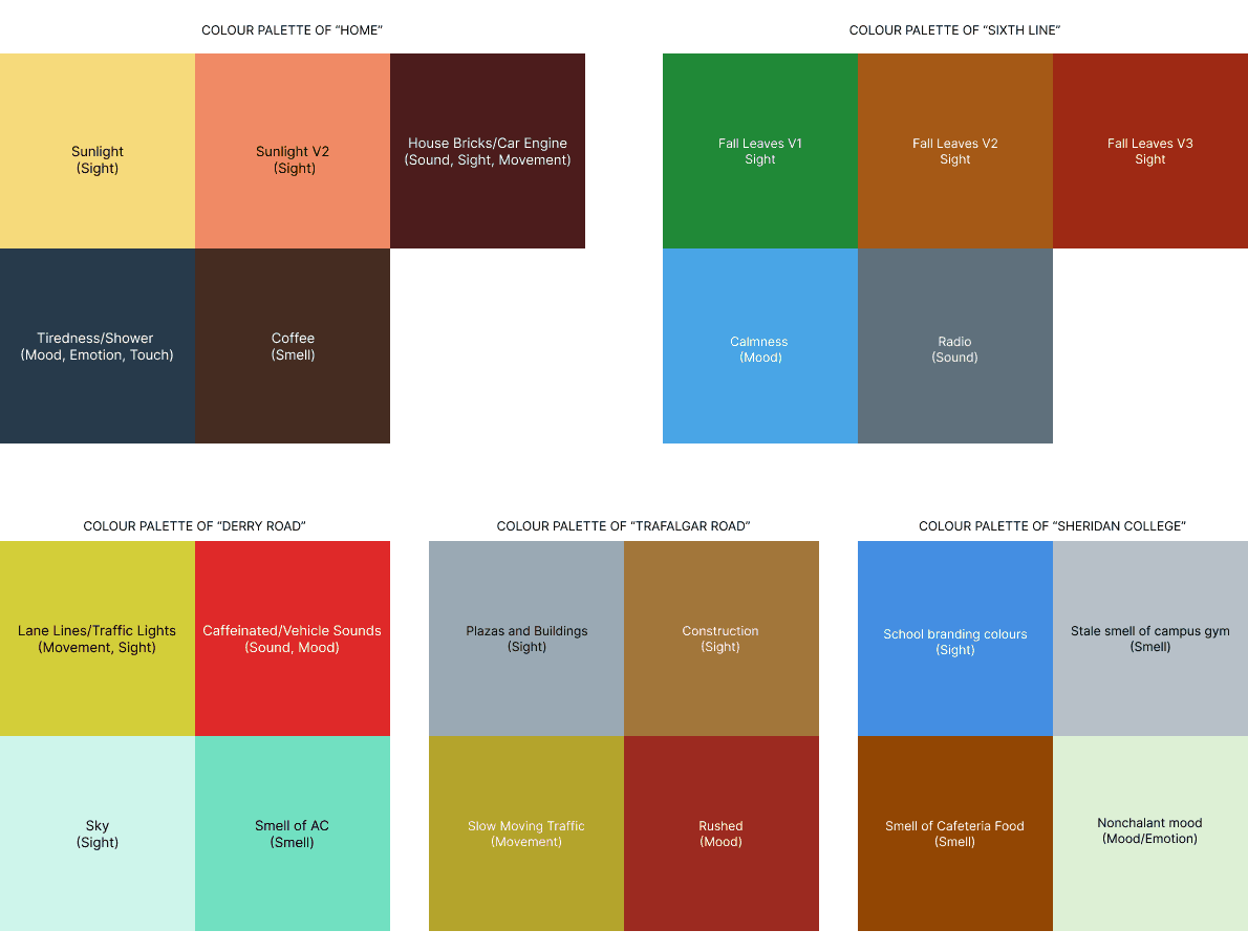 To understand the morning commute required collecting data in multiple sensory categories such as sight, sound, smell, temperature, movement, and emotional state from home to campus. This sensory dataset established a personal, evolving record of the journey, capturing everything from the cool blues of early light and the texture of traffic noise to the warmth of the car interior and the rising alertness that develops closer to arrival. Creating a moodboard and colour palettes were used for examining how abstract shapes, gradients, and atmospheric palettes communicate rhythm, emotion, and environmental change. This research provided a foundation for translating subjective sensations into a cohesive visual language that reflects the emotional arc and sensory complexity of the commute.